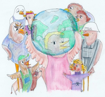 “I like to think that we’re all in this together” said Linda. “Everyone in Bauville uses Berries. Each of us thinks there are plenty of Berries, but only the Berry Factory knows how much it all adds up to. I didn’t know we were wasting Berries, and I’ll bet Cog and all my other neighbors didn’t know that either, and I’ll bet most of us didn’t know about how the Ceeotu clogs the sky. We used to think that there was plenty of everything for everyone, but since there are so many more people and so many more Zervs, it looks like it adds up really much faster than anyone thought! The Earth is only so big!” She stretched out her arms to show the size of a Really Big Fish.